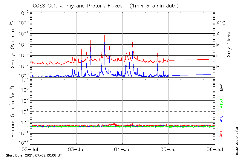 This page provides light-curves generated from GOES soft X-ray and Particle data for the date indicated at the top and the preceding three days.
