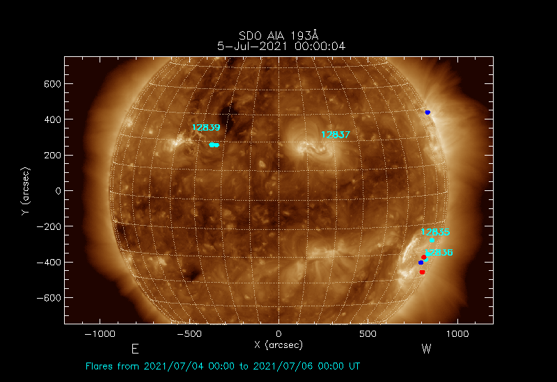 The most recent flares (≤12 hours) are shown as red dots, 12-24 hours ago as blue dots and older ones as turquoise dots.