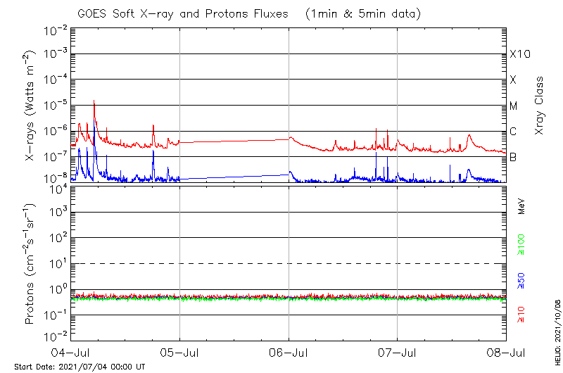 This page provides light-curves generated from GOES soft X-ray and Particle data for the date indicated at the top and the preceding three days.