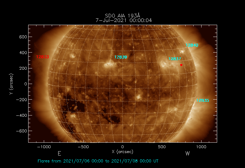 Click on an Active Region plot to display the Region Report including the region evolution and flaring history. HEC Search for NOAA Active Regions (SRS) records for this date and the day before.