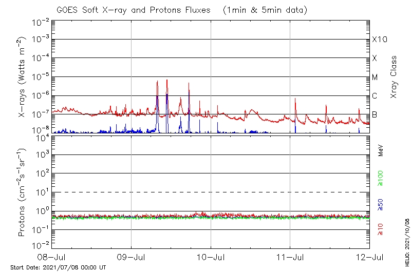 This page provides light-curves generated from GOES soft X-ray and Particle data for the date indicated at the top and the preceding three days.