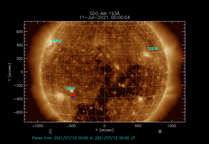 The most recent flares (≤12 hours) are shown as red dots, 12-24 hours ago as blue dots and older ones as turquoise dots.