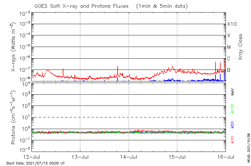 This page provides light-curves generated from GOES soft X-ray and Particle data for the date indicated at the top and the preceding three days.