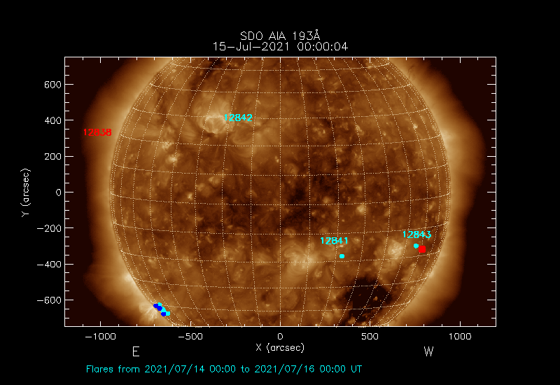 The most recent flares (≤12 hours) are shown as red dots, 12-24 hours ago as blue dots and older ones as turquoise dots.