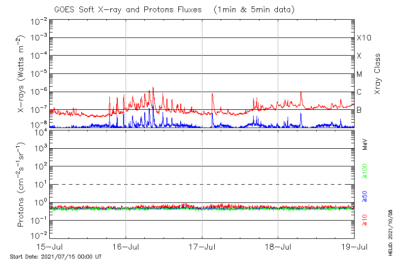 This page provides light-curves generated from GOES soft X-ray and Particle data for the date indicated at the top and the preceding three days.
