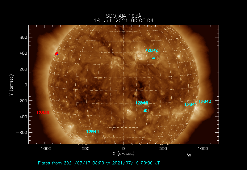 The most recent flares (≤12 hours) are shown as red dots, 12-24 hours ago as blue dots and older ones as turquoise dots.