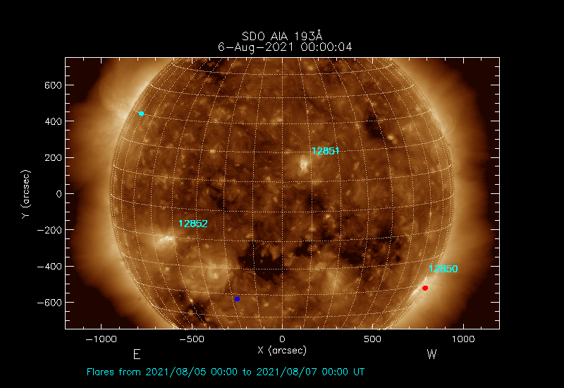 The most recent flares (≤12 hours) are shown as red dots, 12-24 hours ago as blue dots and older ones as turquoise dots.