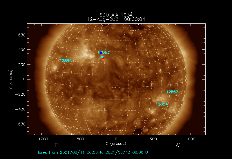 The most recent flares (≤12 hours) are shown as red dots, 12-24 hours ago as blue dots and older ones as turquoise dots.