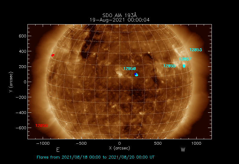 The most recent flares (≤12 hours) are shown as red dots, 12-24 hours ago as blue dots and older ones as turquoise dots.