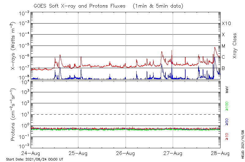 This page provides light-curves generated from GOES soft X-ray and Particle data for the date indicated at the top and the preceding three days.