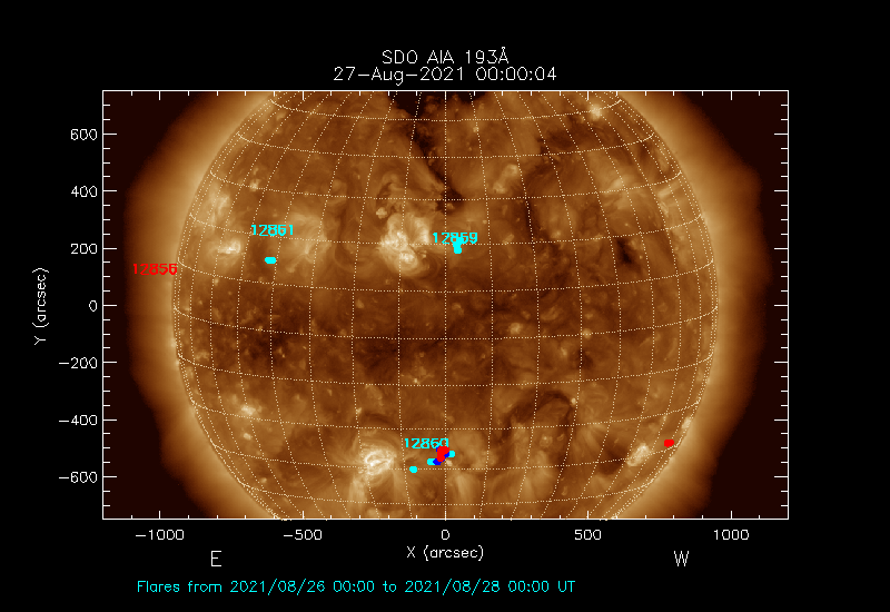 The most recent flares (≤12 hours) are shown as red dots, 12-24 hours ago as blue dots and older ones as turquoise dots.