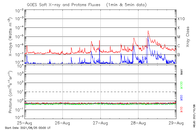 This page provides light-curves generated from GOES soft X-ray and Particle data for the date indicated at the top and the preceding three days.