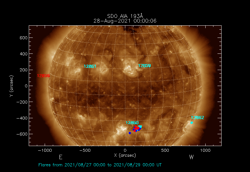 The most recent flares (≤12 hours) are shown as red dots, 12-24 hours ago as blue dots and older ones as turquoise dots.