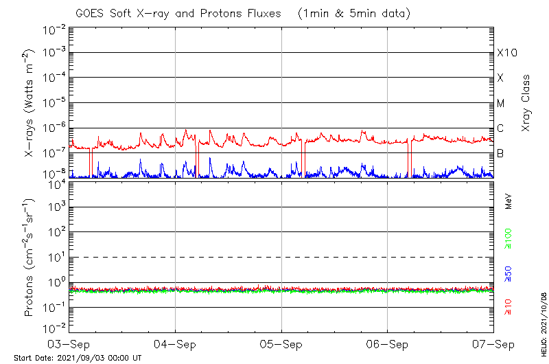 This page provides light-curves generated from GOES soft X-ray and Particle data for the date indicated at the top and the preceding three days.