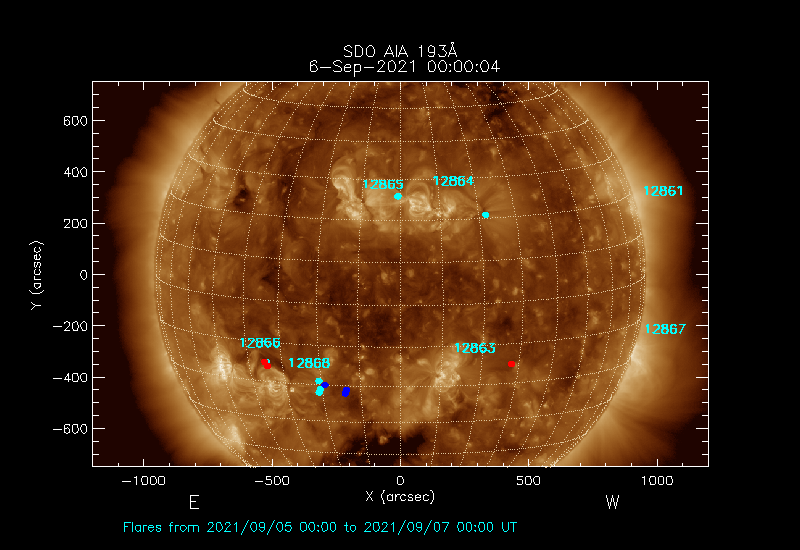 The most recent flares (≤12 hours) are shown as red dots, 12-24 hours ago as blue dots and older ones as turquoise dots.