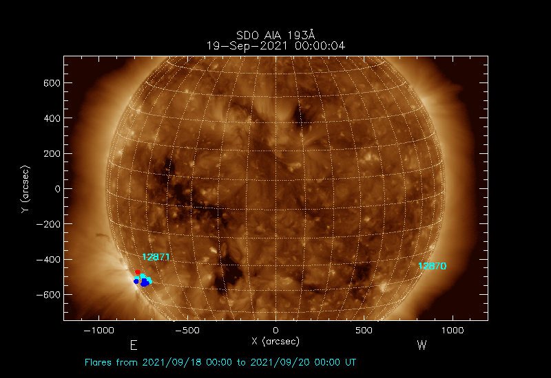 The most recent flares (≤12 hours) are shown as red dots, 12-24 hours ago as blue dots and older ones as turquoise dots.