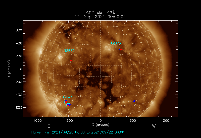 The most recent flares (≤12 hours) are shown as red dots, 12-24 hours ago as blue dots and older ones as turquoise dots.
