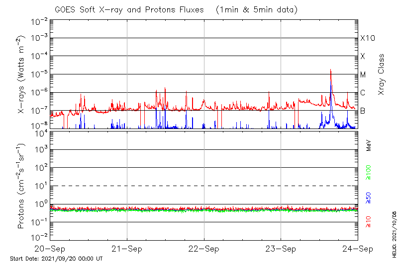 This page provides light-curves generated from GOES soft X-ray and Particle data for the date indicated at the top and the preceding three days.