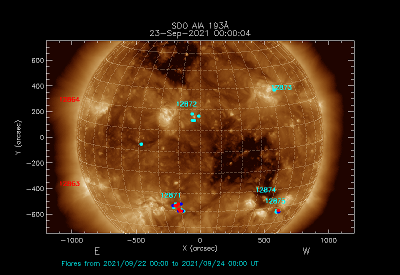 The most recent flares (≤12 hours) are shown as red dots, 12-24 hours ago as blue dots and older ones as turquoise dots.