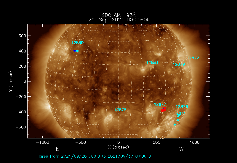 The most recent flares (≤12 hours) are shown as red dots, 12-24 hours ago as blue dots and older ones as turquoise dots.