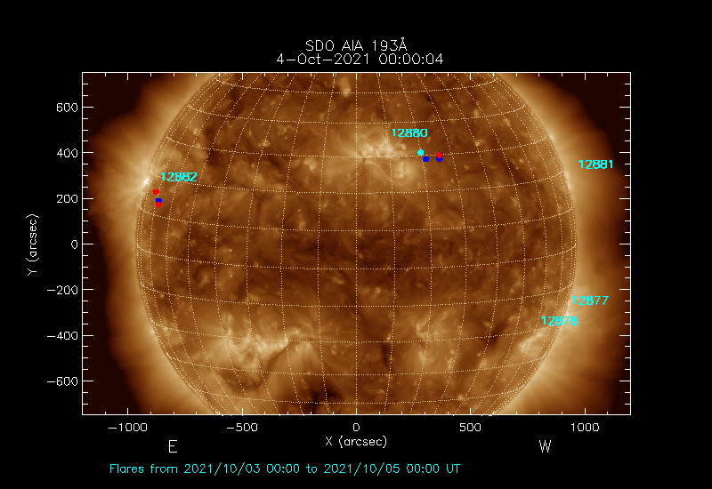 dots and 24-48 hours as turquoise dots; the flare locations are rotated to the time of the image.