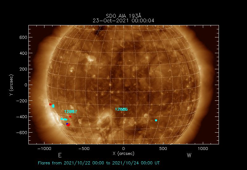 Flares for the 48 hours leading up to the time are over-plotted; these are rotated to the time of the FITS image.