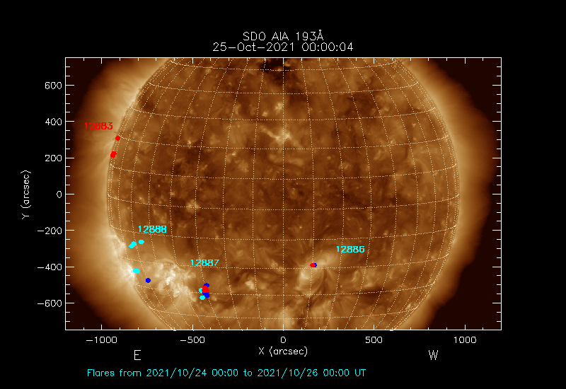The most recent flares (≤12 hours) are shown as red dots, 12-24 hours ago as blue dots and older ones as turquoise dots.