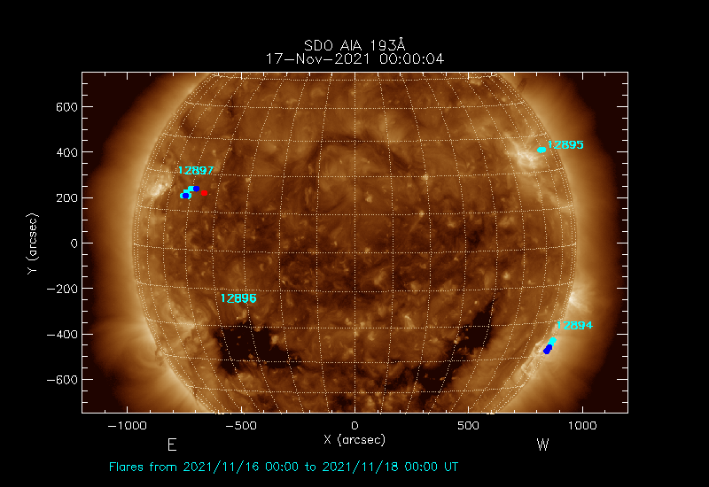 The most recent flares (≤12 hours) are shown as red dots, 12-24 hours ago as blue dots and older ones as turquoise dots.