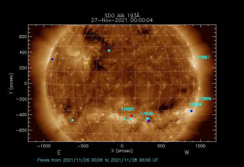 The most recent flares (≤12 hours) are shown as red dots, 12-24 hours ago as blue dots and older ones as turquoise dots.