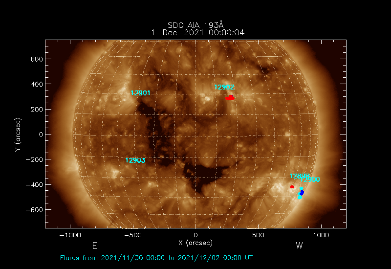 The most recent flares (≤12 hours) are shown as red dots, 12-24 hours ago as blue dots and older ones as turquoise dots.