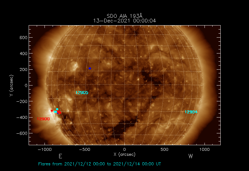 Flares for the 48 hours leading up to the time are over-plotted; these are rotated to the time of the FITS image.