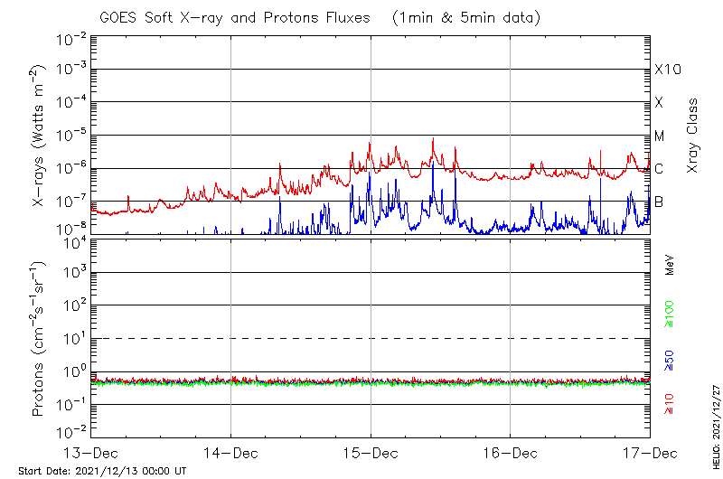This page provides light-curves generated from GOES soft X-ray and Particle data for the date indicated at the top and the preceding three days.