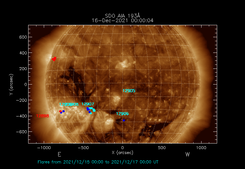 The most recent flares (≤12 hours) are shown as red dots, 12-24 hours ago as blue dots and older ones as turquoise dots.
