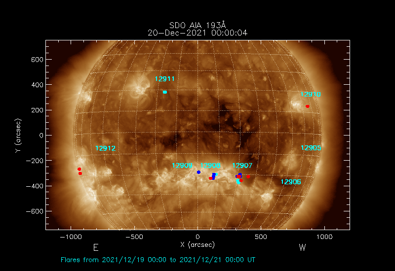 The most recent flares (≤12 hours) are shown as red dots, 12-24 hours as blue