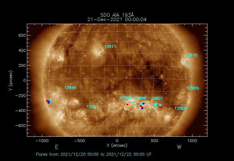 The most recent flares (≤12 hours) are shown as red dots, 12-24 hours ago as blue dots and older ones as turquoise dots.