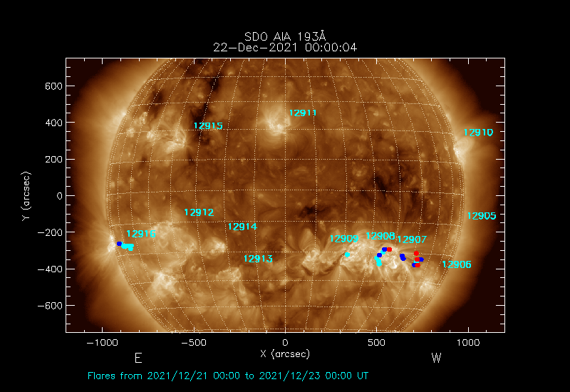 The most recent flares (≤12 hours) are shown as red dots, 12-24 hours ago as blue dots and older ones as turquoise dots.