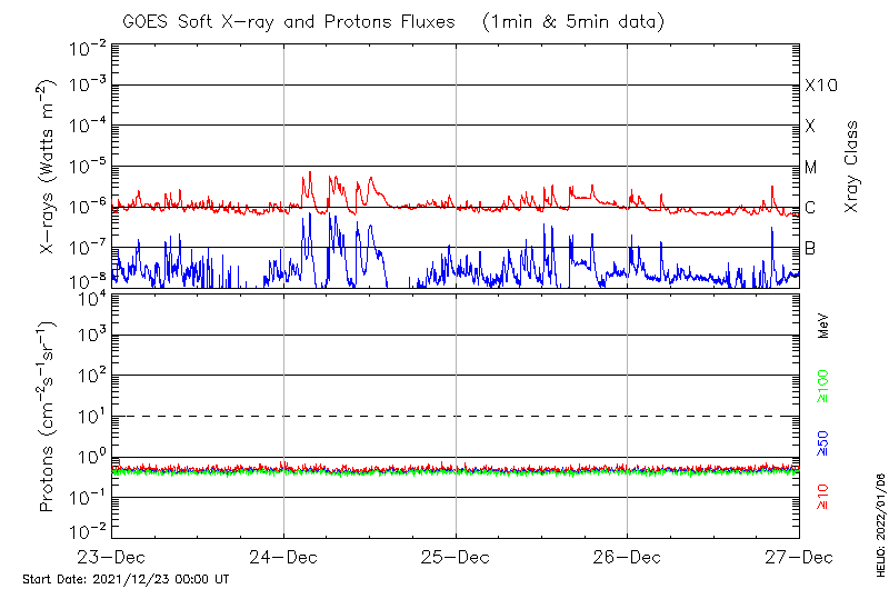 This page provides light-curves generated from GOES soft X-ray and Particle data for the date indicated at the top and the preceding three days.