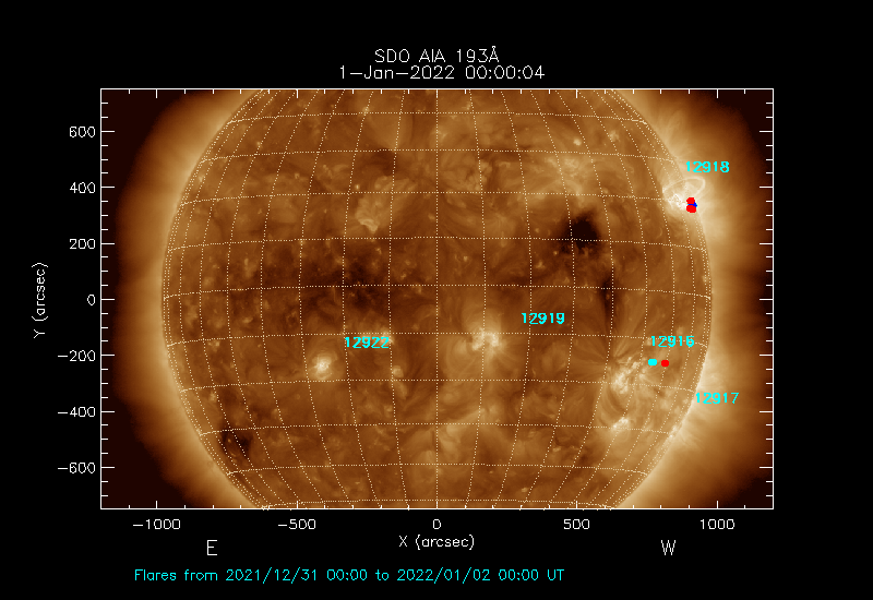 The most recent flares (≤12 hours) are shown as red dots, 12-24 hours ago as blue dots and older ones as turquoise dots.