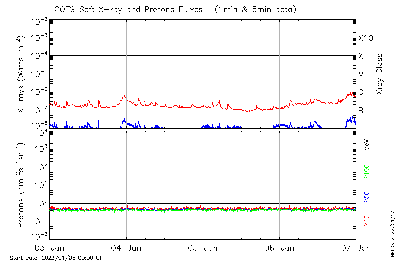 This page provides light-curves generated from GOES soft X-ray and Particle data for the date indicated at the top and the preceding three days.