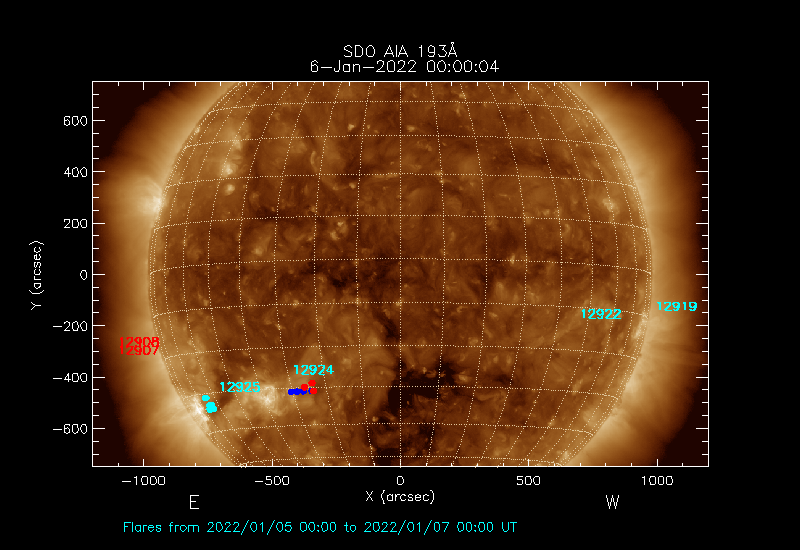 The most recent flares (≤12 hours) are shown as red dots, 12-24 hours ago as blue dots and older ones as turquoise dots.