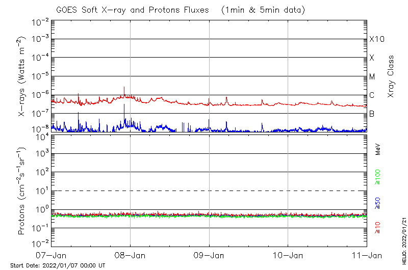 This page provides light-curves generated from GOES soft X-ray and Particle data for the date indicated at the top and the preceding three days.