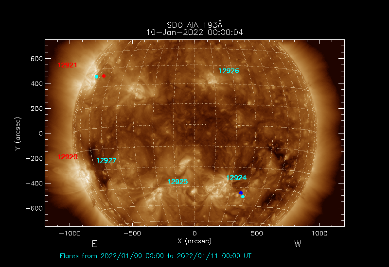 The most recent flares (≤12 hours) are shown as red dots, 12-24 hours ago as blue dots and older ones as turquoise dots.