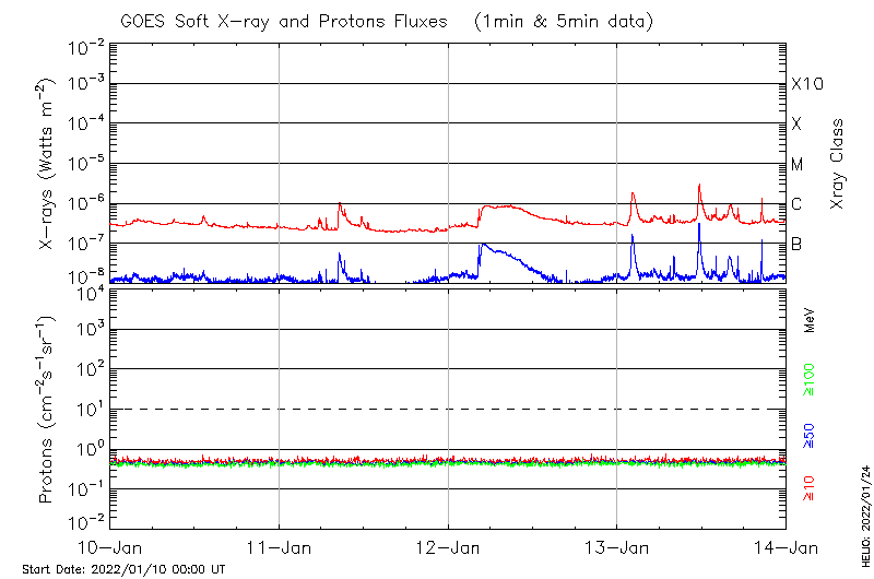 This page provides light-curves generated from GOES soft X-ray and Particle data for the date indicated at the top and the preceding three days.