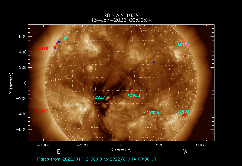 The most recent flares (≤12 hours) are shown as red dots, 12-24 hours ago as blue dots and older ones as turquoise dots.