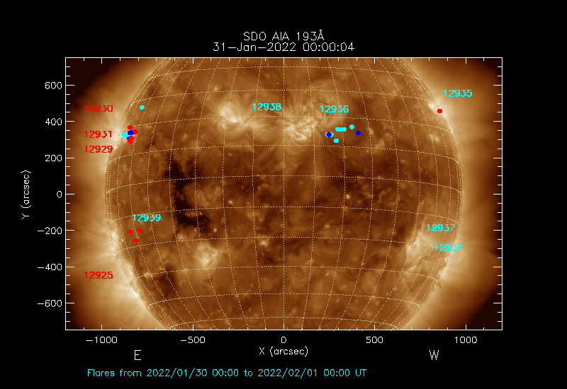 The most recent flares (≤12 hours) are shown as red dots, 12-24 hours ago as blue dots and older ones as turquoise dots.