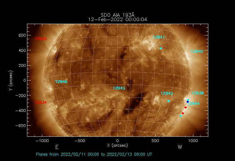 The most recent flares (≤12 hours) are shown as red dots, 12-24 hours ago as blue dots and older ones as turquoise dots.