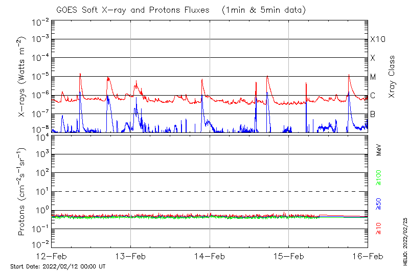 This page provides light-curves generated from GOES soft X-ray and Particle data for the date indicated at the top and the preceding three days.