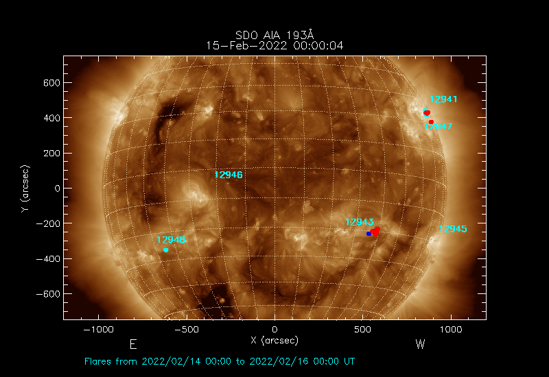 The most recent flares (≤12 hours) are shown as red dots, 12-24 hours ago as blue dots and older ones as turquoise dots.