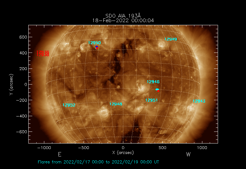 The most recent flares (≤12 hours) are shown as red dots, 12-24 hours ago as blue dots and older ones as turquoise dots.
