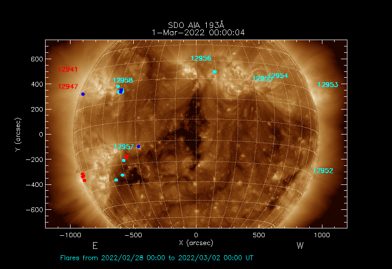 The most recent flares (≤12 hours) are shown as red dots, 12-24 hours ago as blue dots and older ones as turquoise dots.